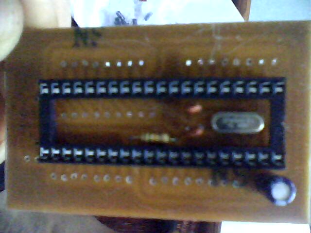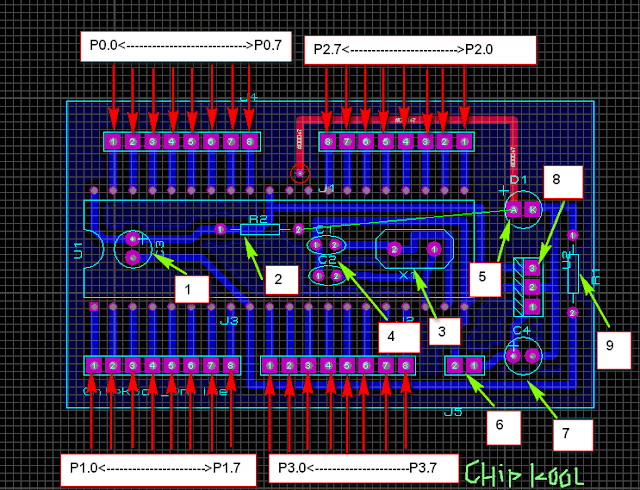 Mạch mình vẽ thêm khối nguồn để ổn định 5V nuôi chip đề phòng chip hỏng,nếu bạn cảm thấy khó thì có thế dùng trược tiếp nguồn từ sạc điện thoại cung cấp trực tiếp cho chip,vì cục sạc nguồn cũng khá ổn định rồi,bạn chỉ việc tách chân sạc ra,tìm chân dương nối với chân 40 của chip,còn chân âm nối với chân 20.Việc tìm chân chip cũng khá đơn giản,bạn nhìn trên bề mặt chip có 1 dấu châm,đó là chân 1 bạn đếm vòng xuống ngược chiều kim đồng hồ sẽ xác định đươc chân.